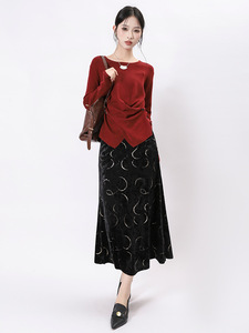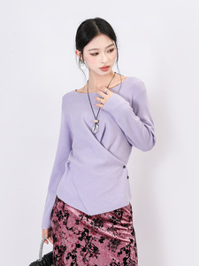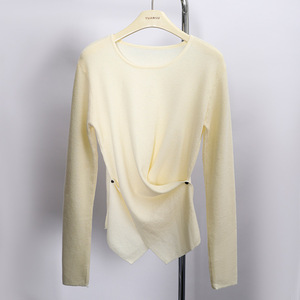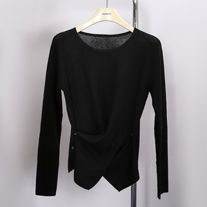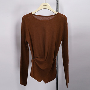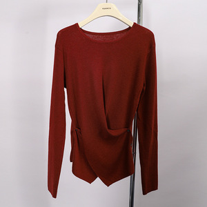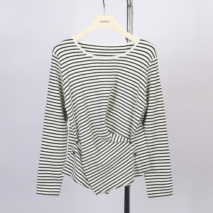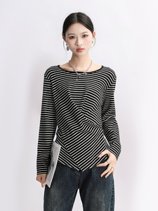 设计感交叉扭结6羊毛长袖上衣女 早秋新款条纹外穿遮腹显瘦T恤衫
