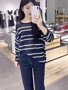 麦*商场同款2025秋季新款空气感罩衫藏青条纹镂空长袖针织衫