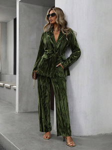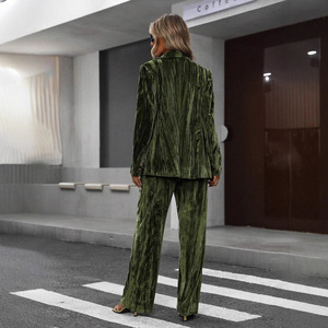 欧美新款复古丝绒西装阔腿裤两件套跨境褶皱OL上衣长裤休闲套装女
