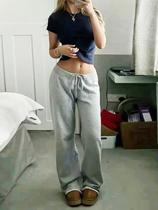 美式街头风酷妹简约基础直筒毛边卫裤翻腰头抽绳系带宽松休闲长裤