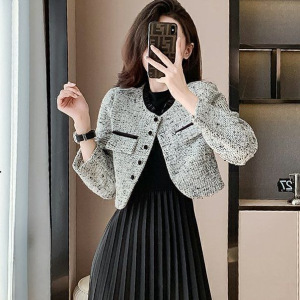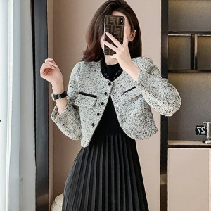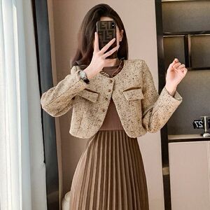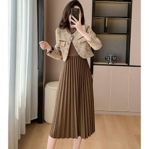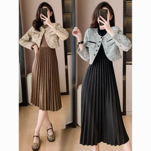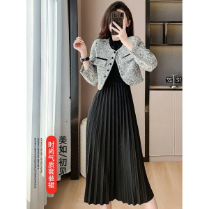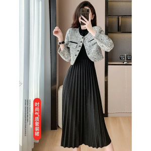 法式小香风套装裙女秋冬新款感小香风短外套百褶连衣裙两件套