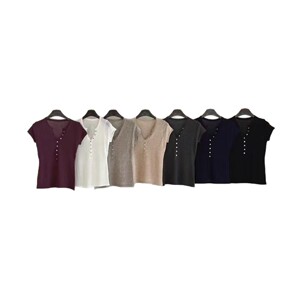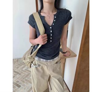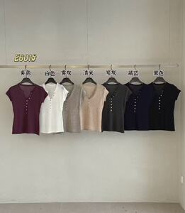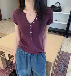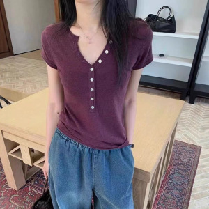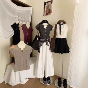 韩版短袖纽扣针织衫女秋季时尚百搭修身显瘦小众设计短款小上衣