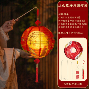 红色花好月圆手提灯笼【30CM】带提杆+流苏+卡扣暖光灯