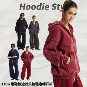 秋冬加绒废土风磨烂散口蜡染外套 炒雪花复古双头拉链头宽松卫衣