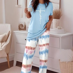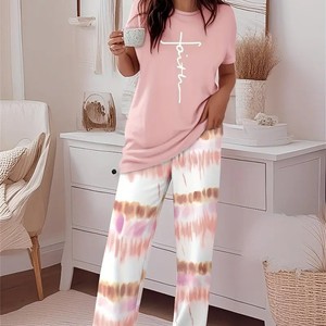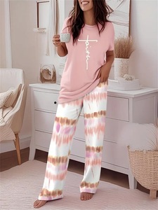 厂家直销跨境春夏简约3D印花睡衣短袖长裤套装休闲女士家居服POD