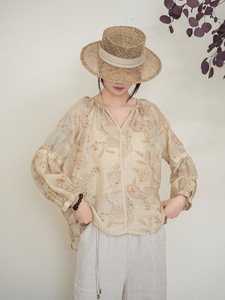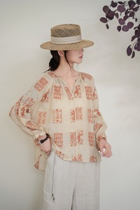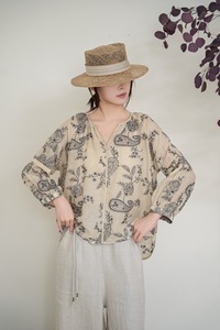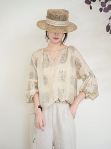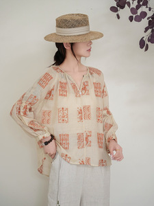 纯苎麻衬衫女 早秋新款 文艺复古宽松显瘦印花百搭休闲长袖T恤398