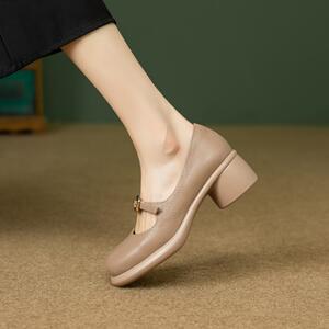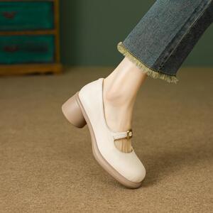 2025春夏新款圆头搭扣厚底粗跟高跟单鞋时尚经典女鞋黑色杏色
