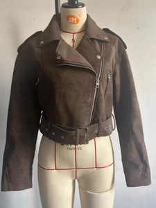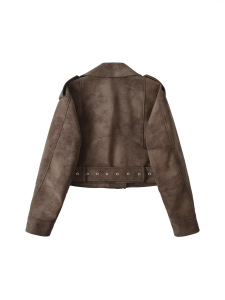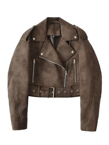 za跨境2025新款秋款欧美风女装经典大翻领配腰带短款仿皮夹克外套