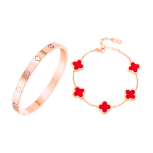 玫瑰金红贝叠戴手链+四叶草带钻手镯
