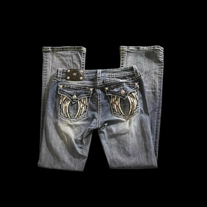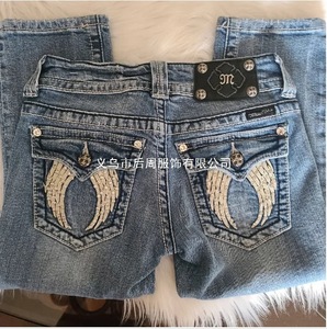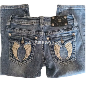跨境街头欧美 miss me时尚牛仔裤女Y2K口袋翼绣花复古牛仔长裤