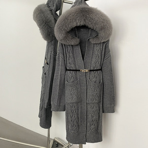 狐狸毛领麻花针织衫开衫女秋新款慵懒宽松显瘦加厚长款毛衣外套女