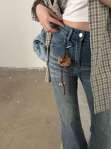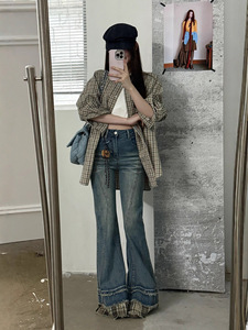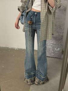 ME KAKAMEE十三行秋季拼接格子毛边微喇牛仔裤女(配KT挂件) C0505