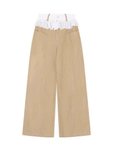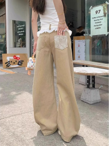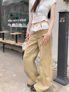 蕾丝花边拼接牛仔裤女夏季新款高腰显瘦设计感卡其色阔腿长裤