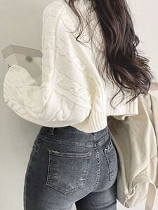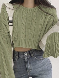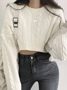 欧美跨境秋冬麻花毛衣女外穿灰色套头简约慵懒风露脐短款针织上衣