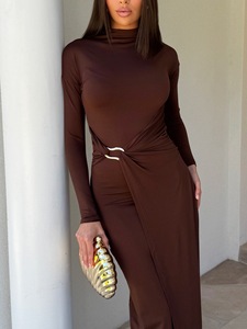 欧美风2025秋季新款时尚美式女装优雅气质修身长袖金属装饰连衣裙