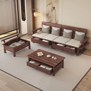 新中式全实木沙发组合黑胡桃木现代简约冬夏两用家用储物直排沙发