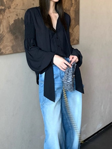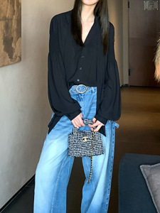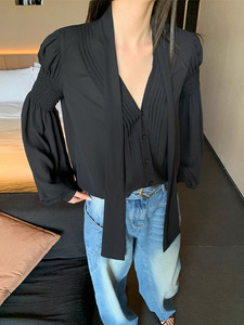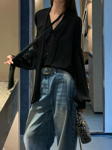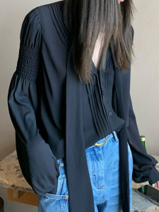 槿一 黑色雪纺衬衫女夏季新款防晒衫宽松圆领设计感衬衣复古气质
