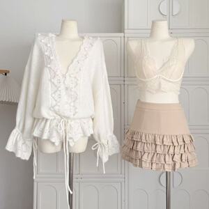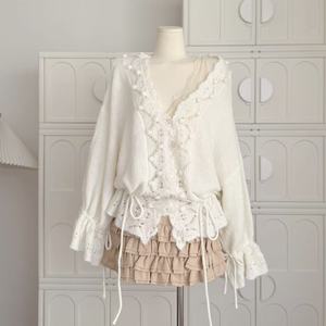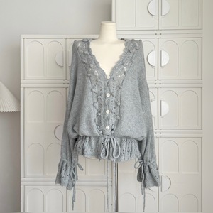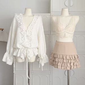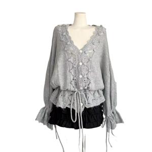 秋款暖朵毛衣镂空钩花毛球V领宽松抽绳下摆针织毛衣