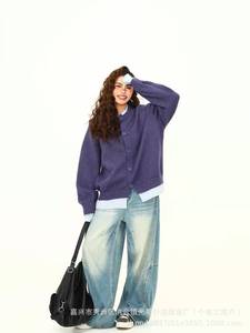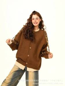 秋冬季拼接假两件开衫毛衣美式复古慵懒风简约设计感宽松针织外套