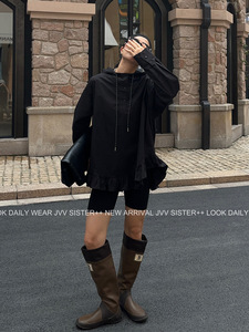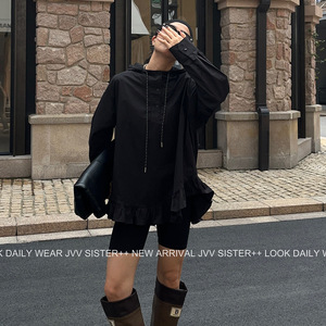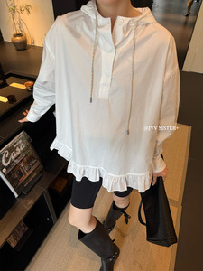 JVV十三行2025秋季新款荷叶下摆宽松连帽套头长袖休闲衬衫女90513