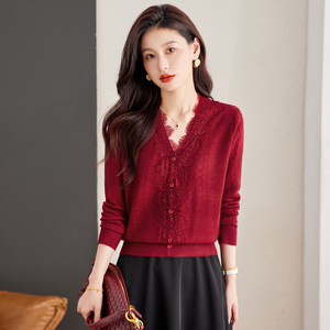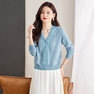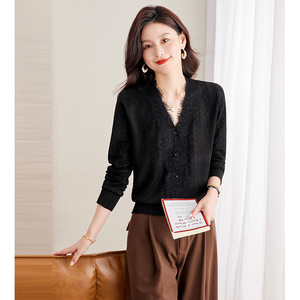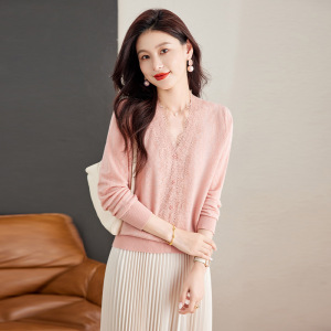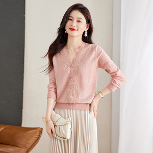 2025早秋新款V领蕾丝拼接薄款针织衫高级感气质上衣长袖t恤打底衫