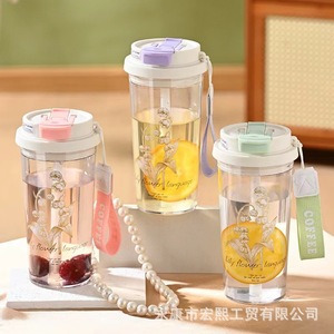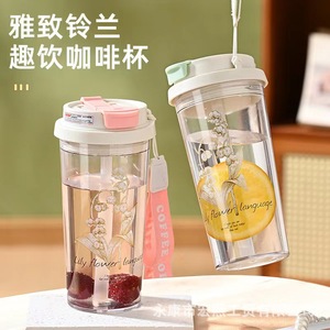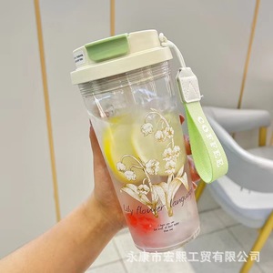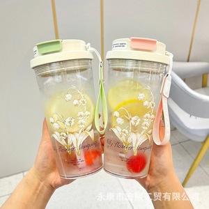 夏季新款铃兰花塑料杯带提绳便携高颜值水杯大容量车载办公室水杯