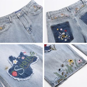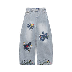 潮牌水洗设计花瓣刺绣弯刀牛仔裤男街头休闲垂感宽松直筒百搭长裤