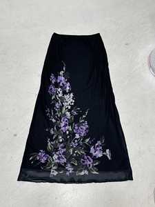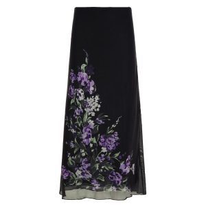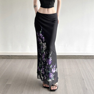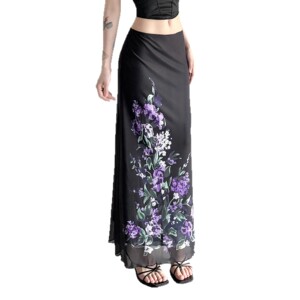 街头古感暗黑风紫色花卉印花高腰显瘦网纱拼接半身裙辣妹中长裙