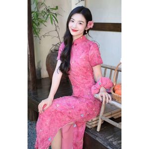 新中式女装玫红色立领盘扣绣花旗袍夏季大方得体高级感国风连衣裙