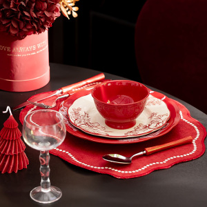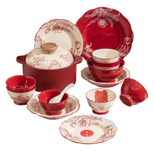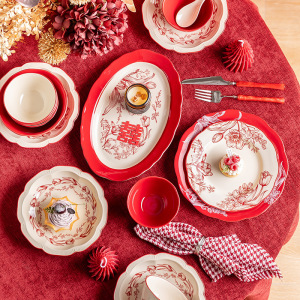 釉下彩新婚碗碟套装家用红色喜庆陶瓷餐具喜碗盘子结婚订婚伴手礼