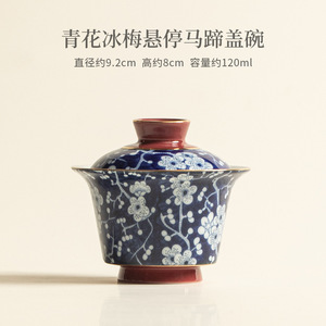 青花冰梅悬停马蹄盖碗家用复古陶瓷泡茶碗茶杯办公室一人饮茶器