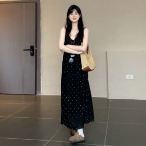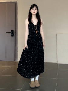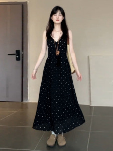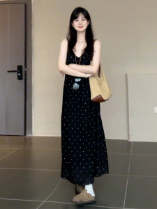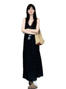 黑色碎花吊带连衣裙子女夏季2025新款夏日绝美海边度假风无袖长裙