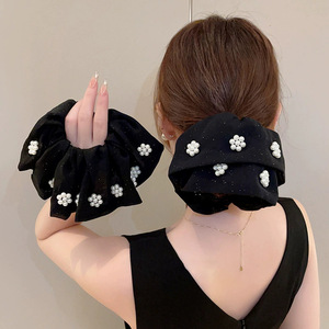 小香风黑色珍珠花朵大肠发圈女后脑勺扎马尾高级感扎发绳皮筋头饰