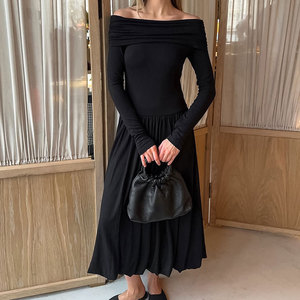 一字肩法式连衣裙女长款春秋新款长袖收腰褶皱显瘦气质百搭a字裙