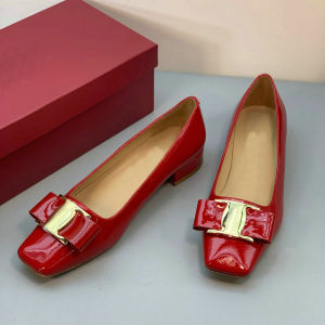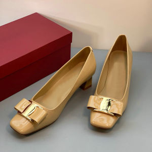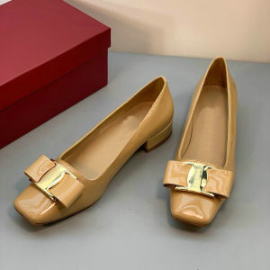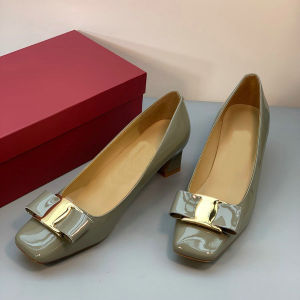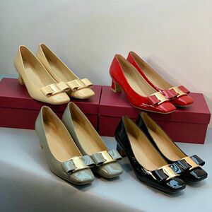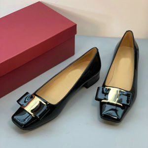 气质时尚高跟鞋! 金属扣漆皮方头蝴蝶结工作鞋粗跟浅口职业单鞋