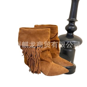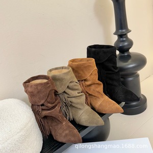 高端2025秋冬真皮尖头复古流苏褶皱堆堆靴中筒切尔西靴西部牛仔靴