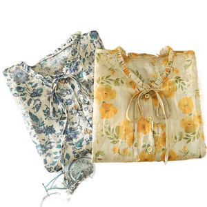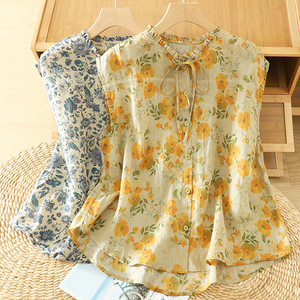 复古木耳领无袖棉麻印花衬衫夏季新款文艺宽松百搭碎花薄款上衣女