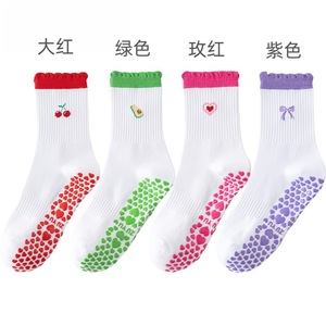 瑜伽袜子女中筒袜点胶防滑木耳花边樱桃刺绣专业训练跑步普拉提袜
