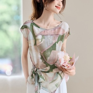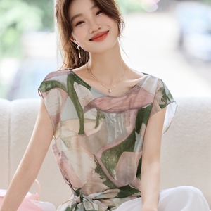 圆领印花飞飞短袖t恤女夏季2025新款薄款雪纺上衣设计感系带小衫