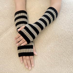 新品双拼色针织条纹毛线防寒保暖装饰袖套手套中长款露指臂套袖子