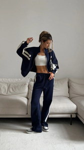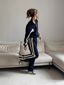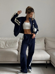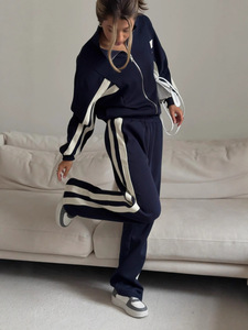2025新款休闲宽条纹拼接套装女装高级感春季卫衣直筒长裤两件套秋