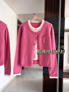 荔莓奶酪假两件针织开衫女秋冬季新款刺绣温柔风短款毛衣外套