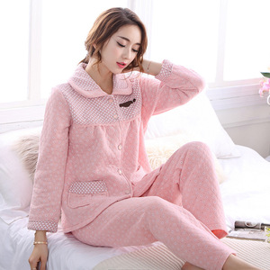 纯棉睡衣女秋冬款长袖加厚家居服春秋季空气棉夹棉保暖夹层