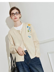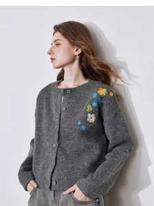 跨境羊绒毛衣女2025春秋新款扣重工花朵刺绣针织开衫休闲百搭上衣