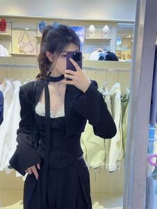 气质御姐风短款长袖西装外套叠穿拼接吊带背心女高腰阔腿裤三件套
