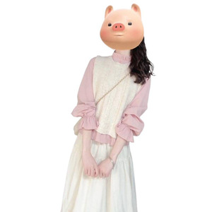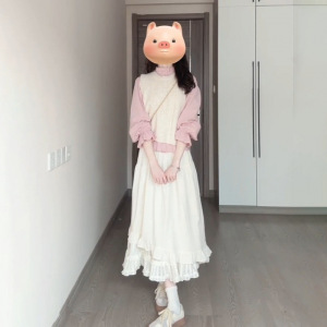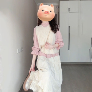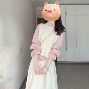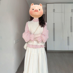 秋季学院风穿搭奶白色麻花针织马甲粉色木耳边领衬衫半身裙三件套