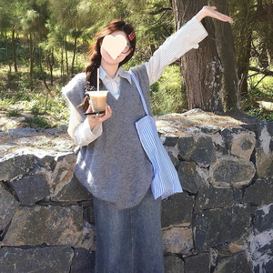 秋季穿搭一整套文艺小清新牛仔半身裙子+灰色马甲+条纹衬衫三件套