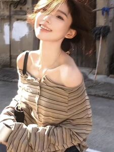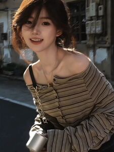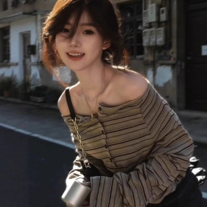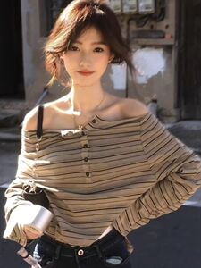 美式复古亨利衫一字肩露肩长袖T恤女春秋季2025新款宽松条纹上衣