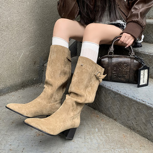 复古绒面西部靴女尖头粗跟大筒围堆堆靴2025新款高跟高筒显瘦长靴