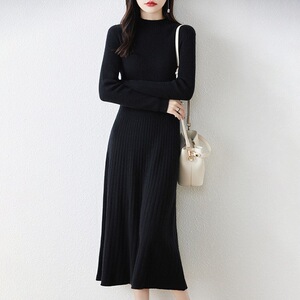 半高领贴身连衣裙女修身2025秋冬款针织长裙显瘦过膝超长毛衣裙